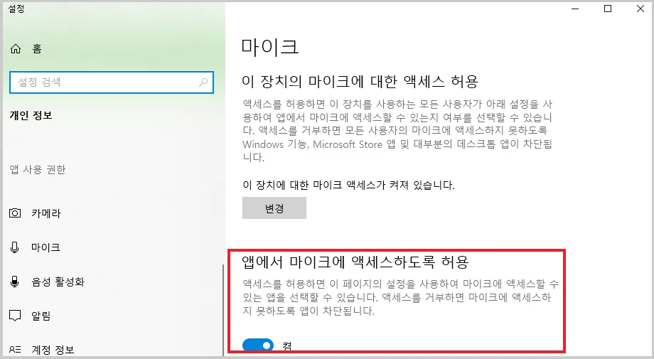 앱에서 마이크에 액세스하도록 허용 항목을 켬으로 설정합니다.