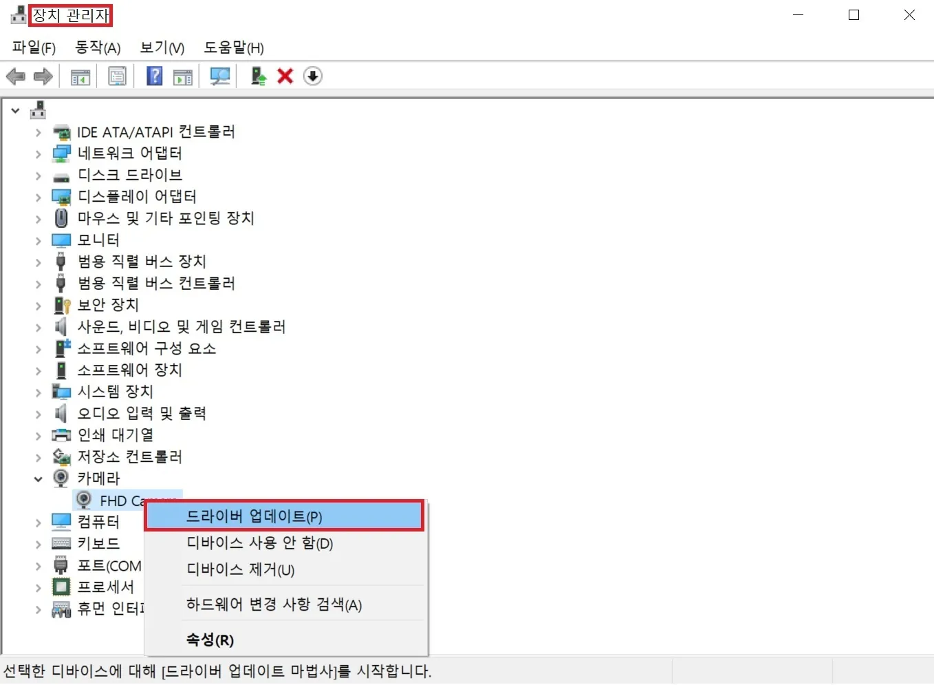 작업 표시줄의 검색 상자에 ’장치 관리자’를 검색해 실행