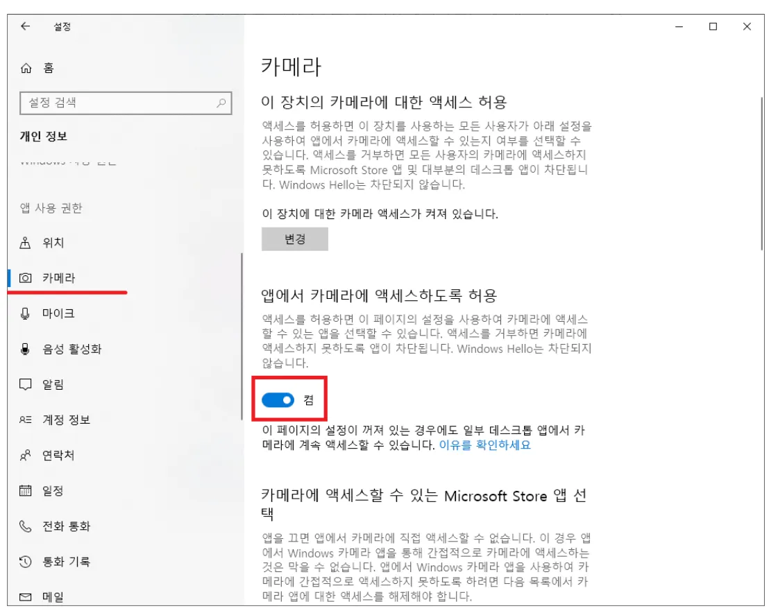 앱에서 카메라에 액세스하도록 허용 항목을 켬으로 설정합니다.