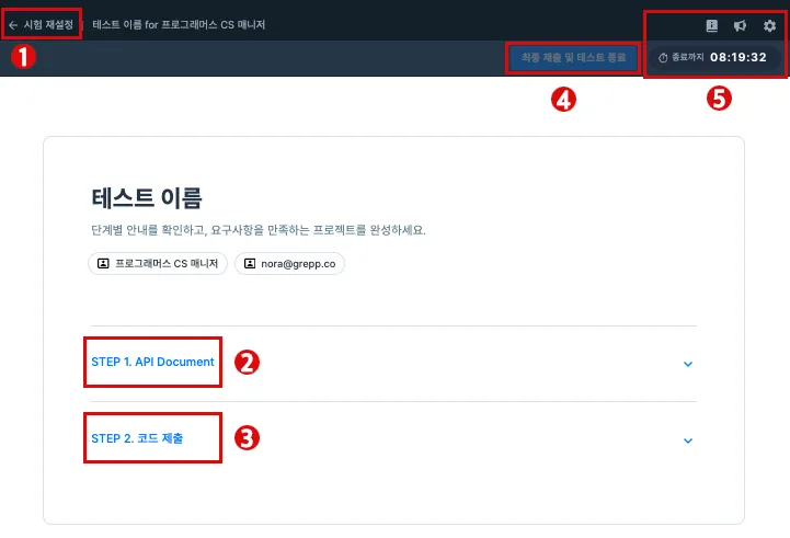 테스트 시간이 끝나기 전에 반드시 최종 제출 및 테스트 종료를 눌러서 테스트를 종료해 주세요.
