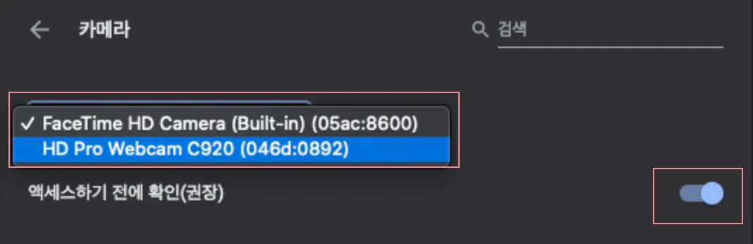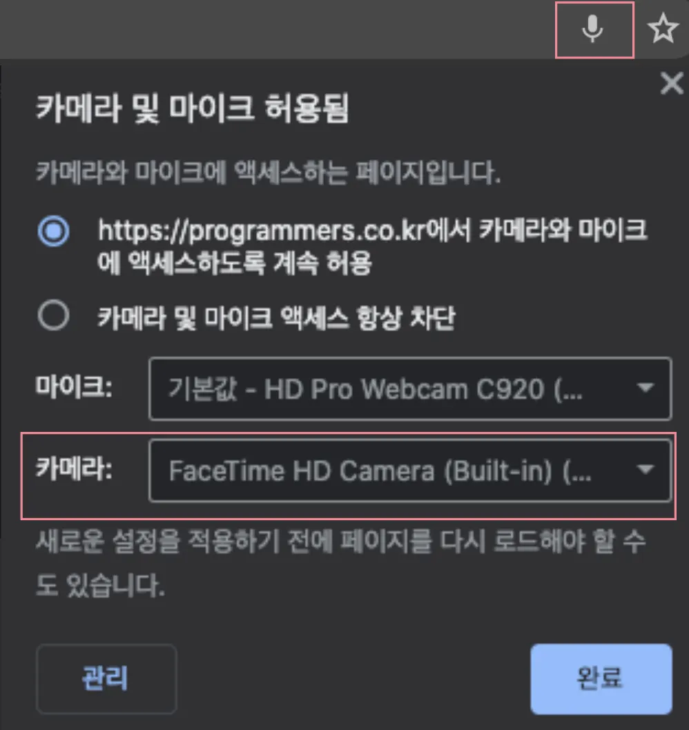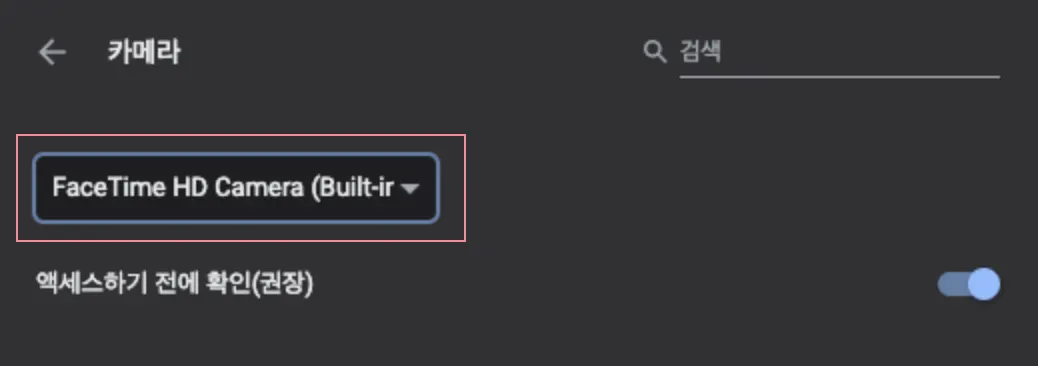 웹캠을 두 개 사용 중인 응시자가 화상 기기 설정 페이지에서 카메라 선택을 바꾸고자 하는 경우, 두 개 카메라 모두 크롬(Chrome)의 카메라 설정에서 접근 권한을 허용해 주어야 합니다.