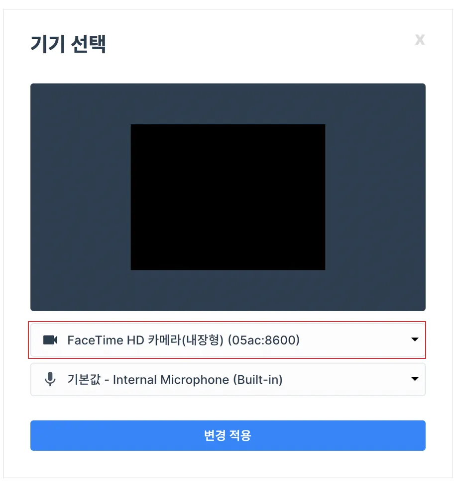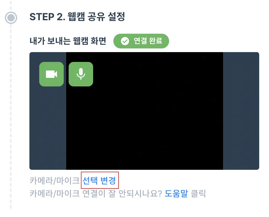 사용하고자 하는 카메라가 선택되어있지 않다면, STEP 2. 웹캠 설정의 카메라/마이크 선택 변경으로 변경하실 수 있습니다.