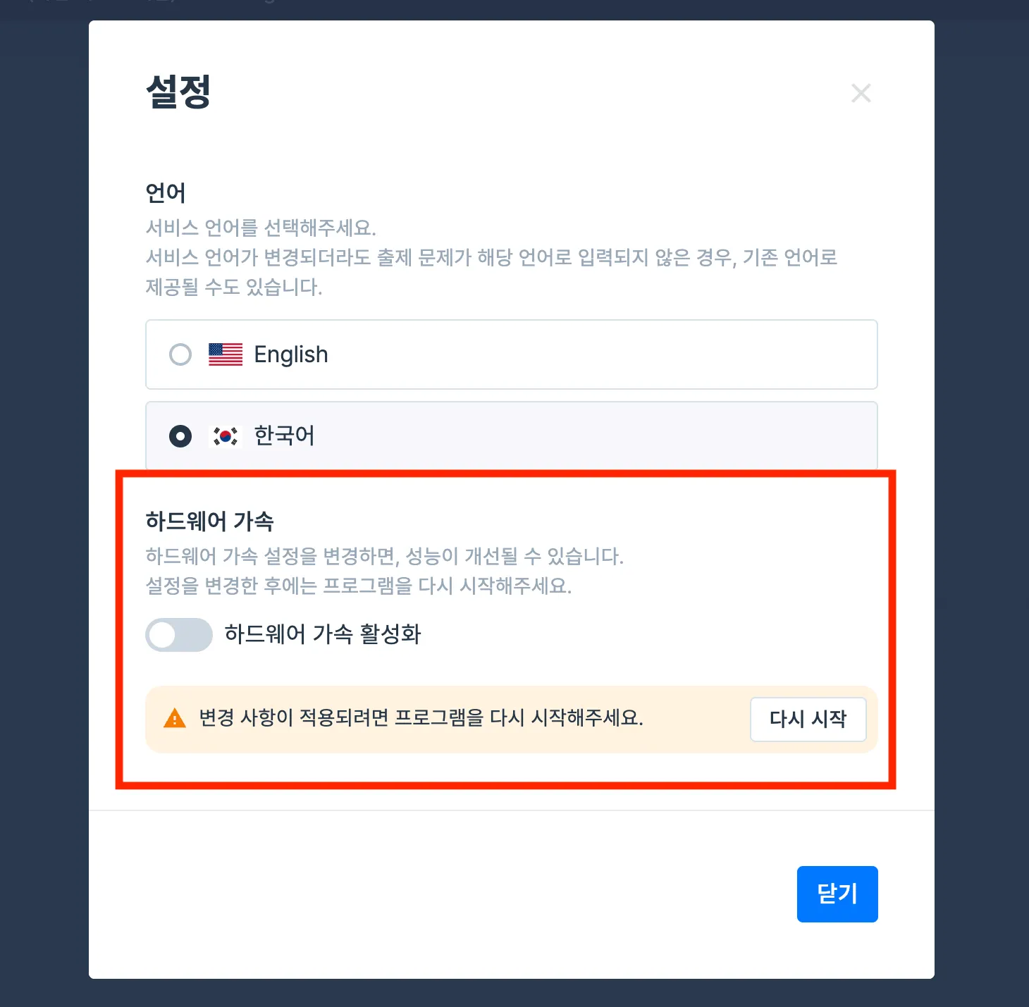 우측 상단 설정 메뉴 > 하드웨어 가속 해제