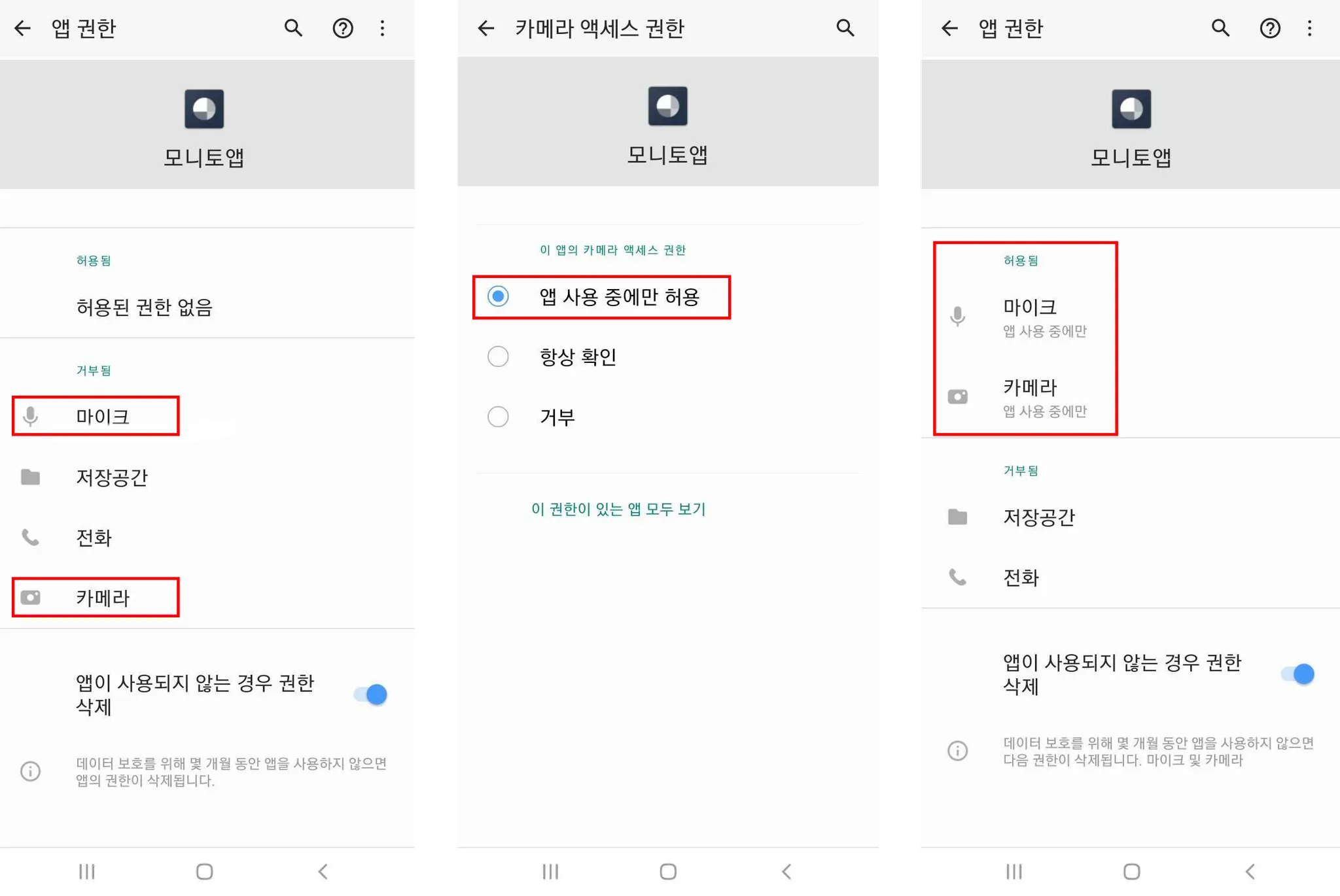 앱 권한 설정 화면은 안드로이드(Android) 버전마다 화면이 조금씩 다르게 보일 수 있습니다. 모니토 앱의 카메라, 마이크 사용을 허용하고 다시 앱으로 접속하여 연결을 진행해 주세요.