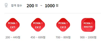 SQL역량인증시험의 합격기준은 200점 기준으로 200점 이상인 경우부터 Lv1을 부여받으며 총 4개 레벨로             구분됩니다. 상세 기준은 아래와 같습니다.