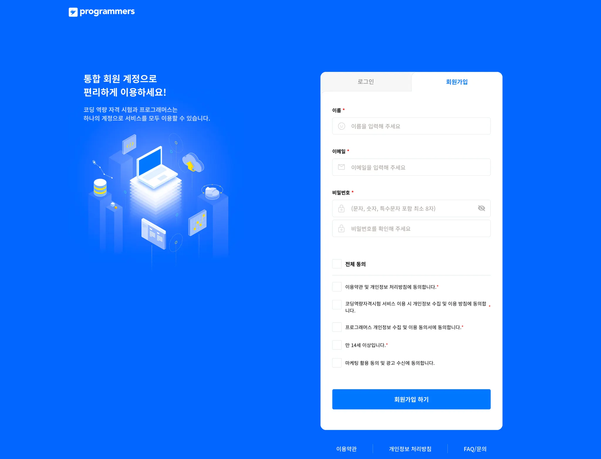 코딩역량인증시험은 프로그래머스(https://programmers.co.kr)와 통합회원계정으로 운영합니다. 프로그래머스나 코딩역량인증시험 회원이 아니라면 회원가입을 이미 프로그래머스 회원이라면, 프로그래머스 회원 계정을 이용해주세요.