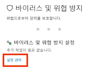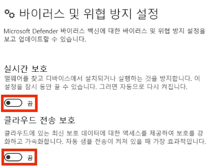 바이러스 및 위협방지 설정 관리 메뉴로 이동해 모든 항목을 ‘끔’으로 변경합니다.
