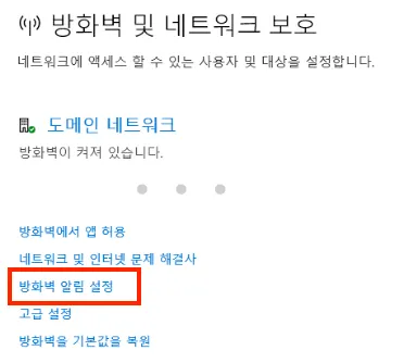 방화벽 및 네트워크 보호 - 방화벽 알림설정 메뉴로 이동해 모든 항목을 ‘끔’으로 변경합니다.