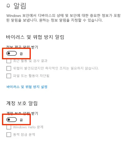 2. 모든 항목을 ‘끔’으로 변경