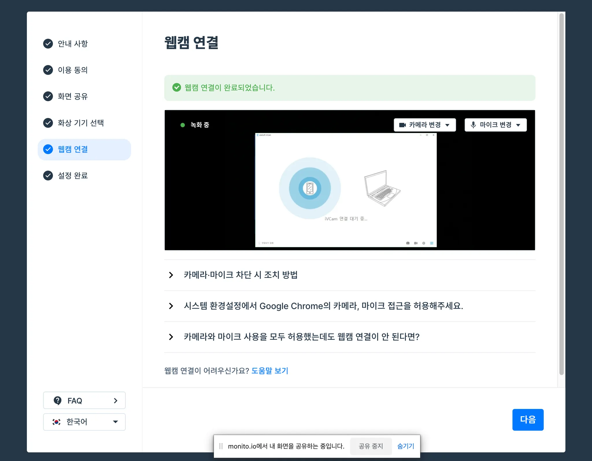 *컴퓨터 내 IVCAM 프로그램 및 IVCAM과 같이 별도의 카메라 프로그램이 설치, 활성화 되어 있는 경우 웹캠 연결이 정상적으로 되지 않을 수 있습니다. 이러한 프로그램이 있다면 종료 및 삭제 해주세요.