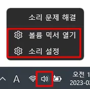 볼륨 믹서와 소리 설정을 확인할 수 있습니다.