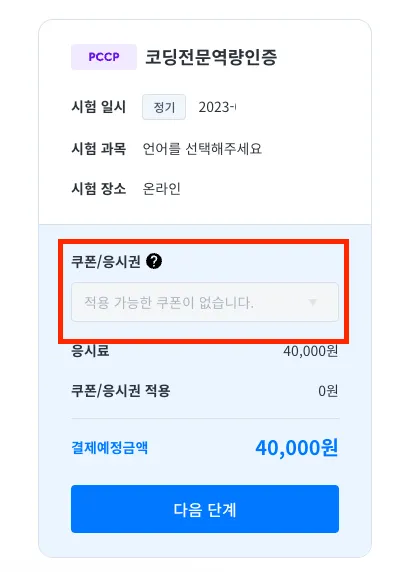 시험 접수 페이지에서 등록한 쿠폰을 선택할 수 있습니다.