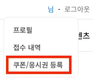 오른쪽 상단 성함 클릭 > 쿠폰/응시권 등록