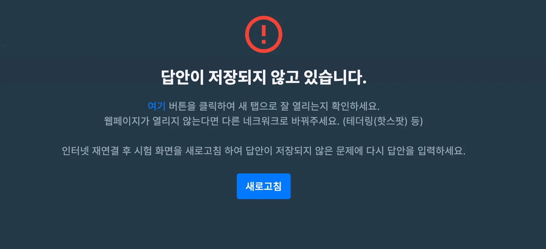 인터넷 재연결 후 시험 화면을 새로고침하여 답안이 저장되지 않은 문제에 다시 답안을 입력해주세요.