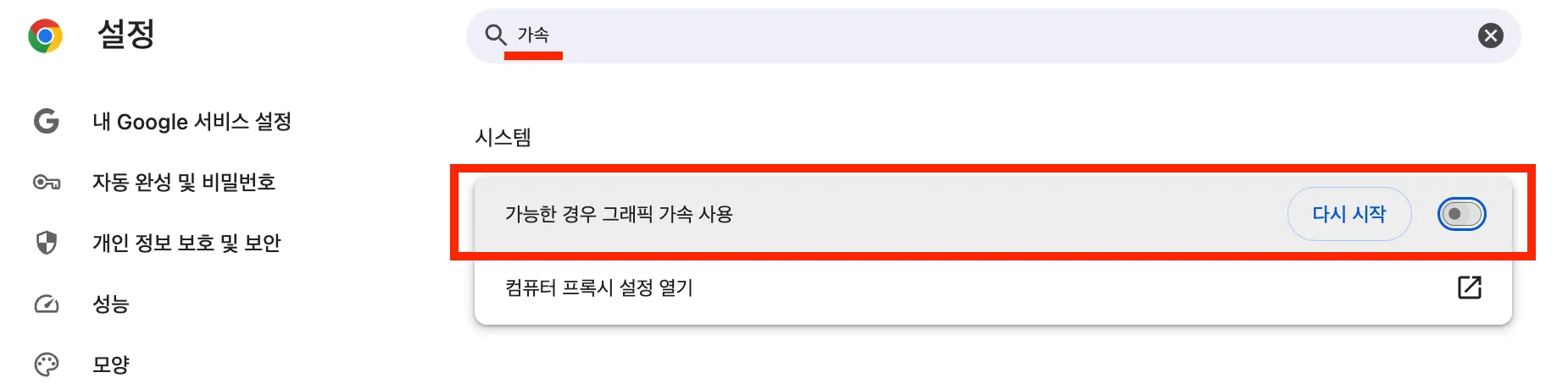 상단 검색 창에 ‘가속’으로 검색하여 가능한 경우 그래픽 가속 사용 항목을 해제해주세요