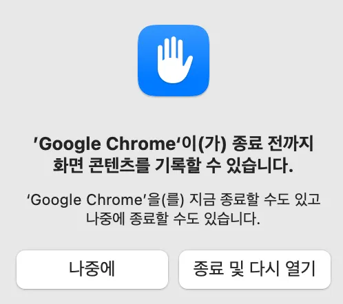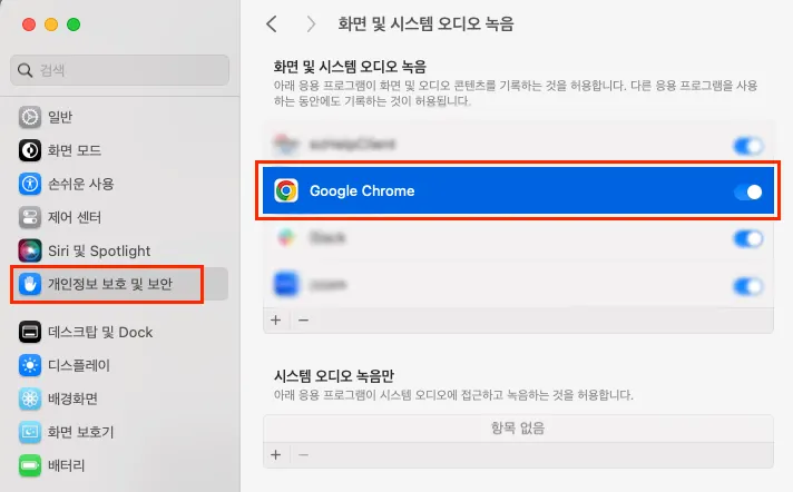 시스템 환경설정 → 개인정보 보호 및 보안 → 화면 및 시스템 오디오 녹음(혹은 화면기록)
