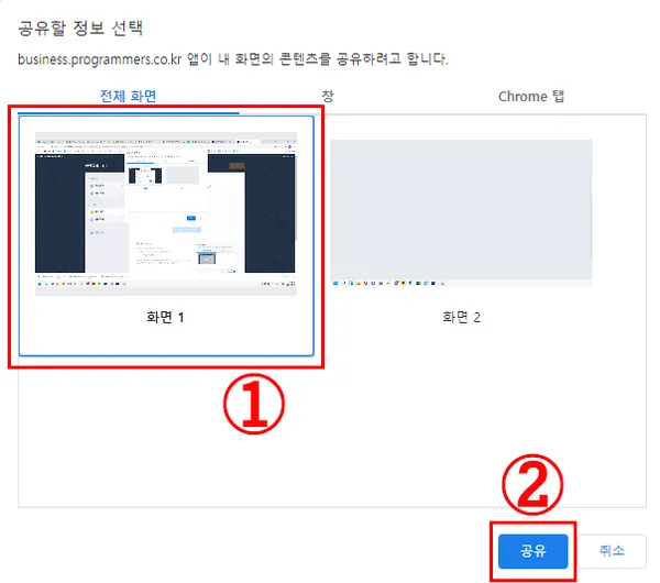 1번 부분을 눌러 공유하실 화면을 선택해주시면, 2번 부분의 공유 버튼이 활성화됩니다.