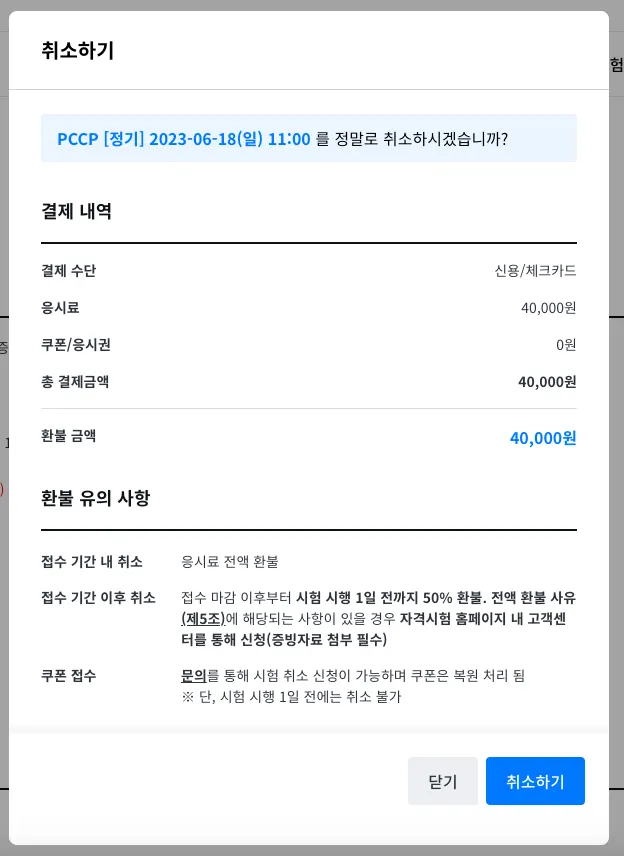 시험 접수 > 접수 내역 > 상세보기 > 접수 취소하기
