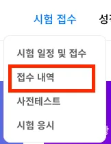 시험 접수 > 접수 내역 메뉴에서 접수한 시험을 취소할 수 있습니다.